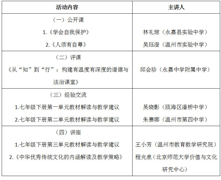 各有关学校,为贯彻和落实新课标教学理念、提高对新教材的理解和使用,温州市邓权忠“名师送教”工作室决定开展第十三次研修活动暨观摩温州市初中道德与法治学科新教材使用研训活动,以提高广大学员深入研究新课标新教材,不断提升课堂教学能力。