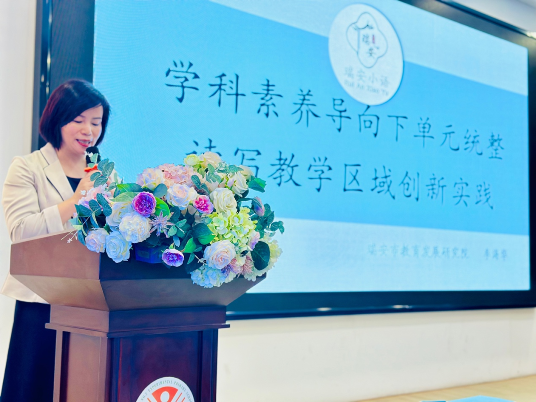 浙江省特级教师、瑞安市小学语文研训员李海华老师以《学科育人导向下单元统整读写教学的瑞安实践》为题进行研修主题阐述。李老师认为当前区域语文教学存在设计失统、过程失策、评价失位、文道失和的现象,由此申报了区域课改项目。两年来,瑞安小语围绕单元统整读写,形成了教学变革导向,研发了任务设计路径,创生了课堂实施范式,构建了教学评价体系,创建了变革的推进范式,促进学生言语智能与精神生命的蓬勃生长,全面提高学生的语文素养,实现学科育人的目标,课改成果荣获温州教学成果一等奖。李老师说瑞安小语能取得如此的丰硕成果得益于温州小语宽阅读、强习作、提素养的语文教学价值追求。