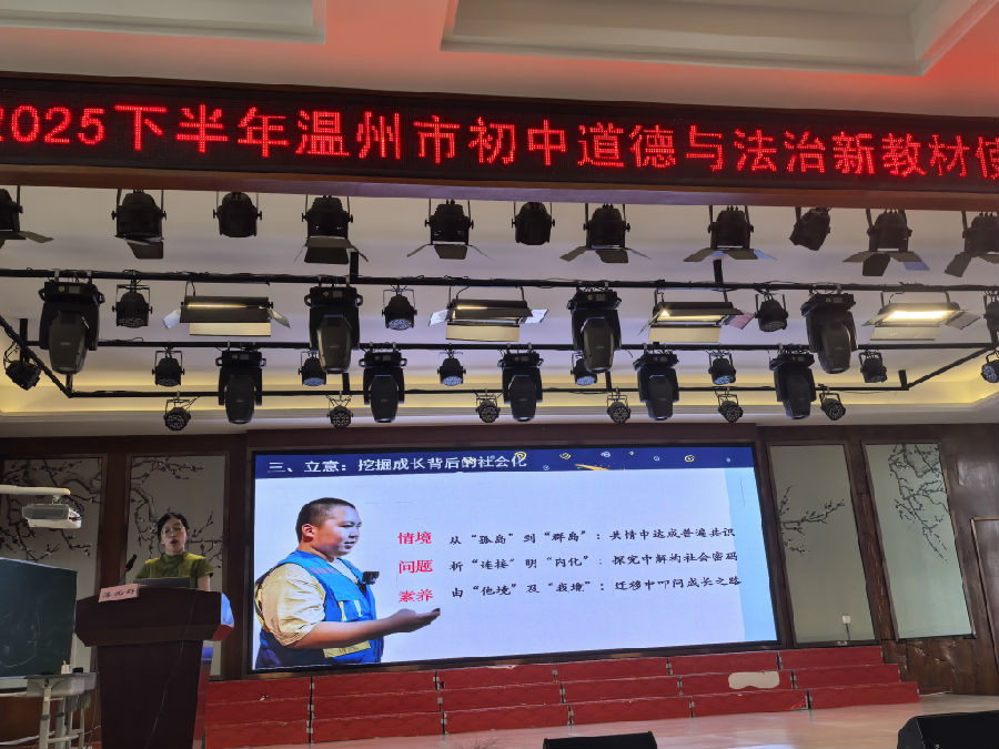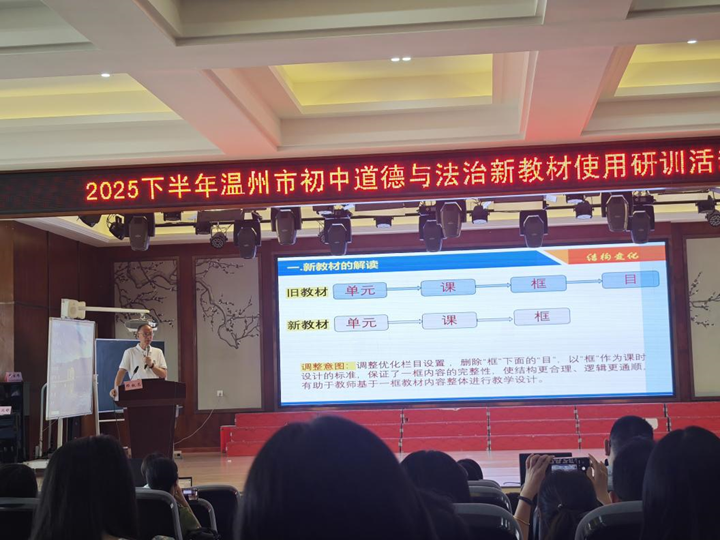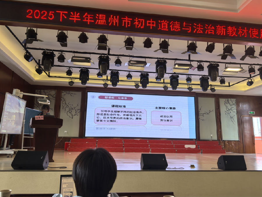 为深入贯彻新课标教学理念,推动初中道德与法治学科新教材的落地实施,9月19日,温州市邓权忠“名师送教”工作室第十五次研修活动暨初中道德与法治新教材使用研训活动在龙港市实验中学举行。本次活动以“聚焦新课标、研读新教材、研讨新课堂”为主题,通过两位青年教师的研讨课、三位优秀教师的观点交流、说课展示、两位特级教师的专家讲座等多元形式,为全市初中道德与法治教师搭建了一个理念碰撞与教学实践的平台,助力教师提升教材解读水平和课堂教学能力。