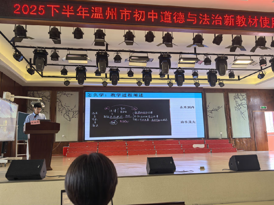 在说课展示环节,温州市第二外国语学校的刘林峰老师围绕《树立法治观念》,从“学什么(课标与教材)——能学什么(学情)——怎么学(案例教学)”三方面,以“老郑案例”解析法治意识的培养路径;龙湾区第二实验中学的潘筱红老师则以《奉献社会我践行》为题,强调“三严三定”教学策略:严扣课标定方向——研学情定方法——研教材定主题,始终突出“实践能力培养”的核心目标。
