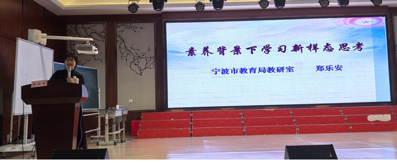 省特级教师、宁波市教育局教研室郑乐安老师则以《素养背景下学习新样态思考》为主题,从“为谁教(关注学生)——教什么(课程重构)——怎么教(模式创新)——谁来教(教师成长)——教成什么样(核心素养)”五个维度,倡导教师打破传统教学框架,构建“以学为中心”的课堂生态,引发在场教师对教学转型的深度思考。